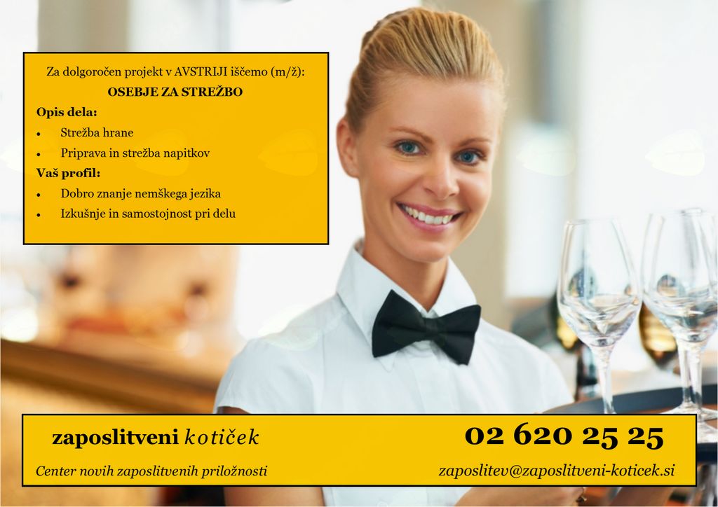 V Avstriji  blizu meje s Slovenijo se za strežbo v prijetni kavarni iščejo sodelavci z dobrim znanjem nemškega jezika in izkušnjami pri delu. Plačilo po avstrijski kolektivni pogodbi.Vas zanima? Pokličite nas na 02 620 25 25 ali nam pišite na zaposlitev@zaposlitveni-koticek.si!
