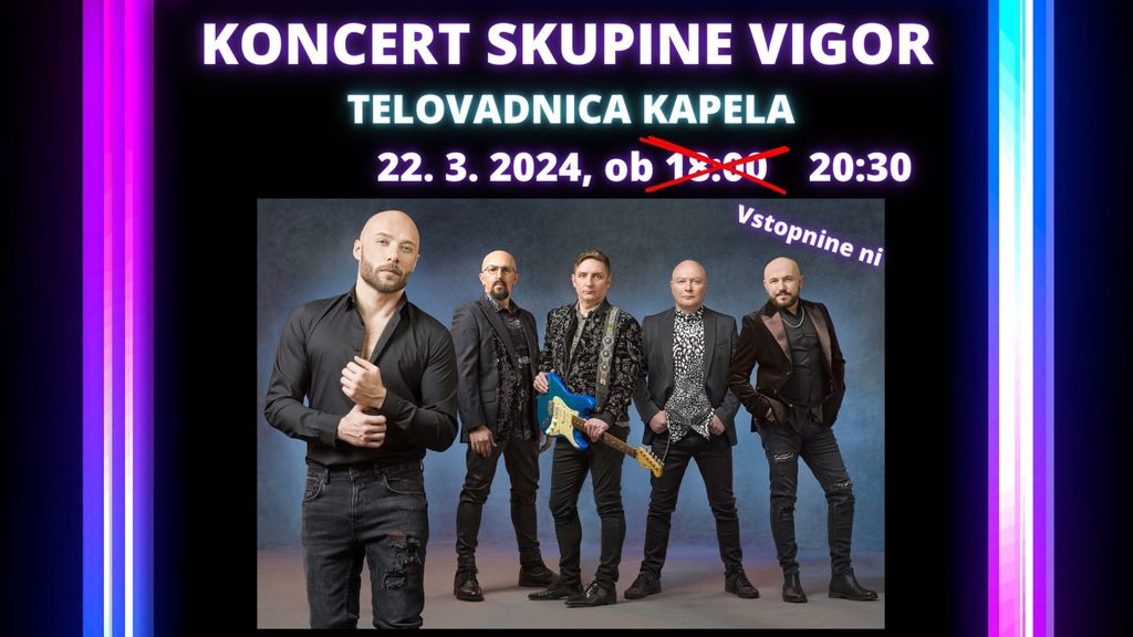 Obveščamo vas, da je prišlo do spremembe ure koncerta zaradi neodložljivih obveznosti glavnega pevca skupine. Prosimo za razumevanje. Prireditev OŠ Kapela bo potekala normalno.