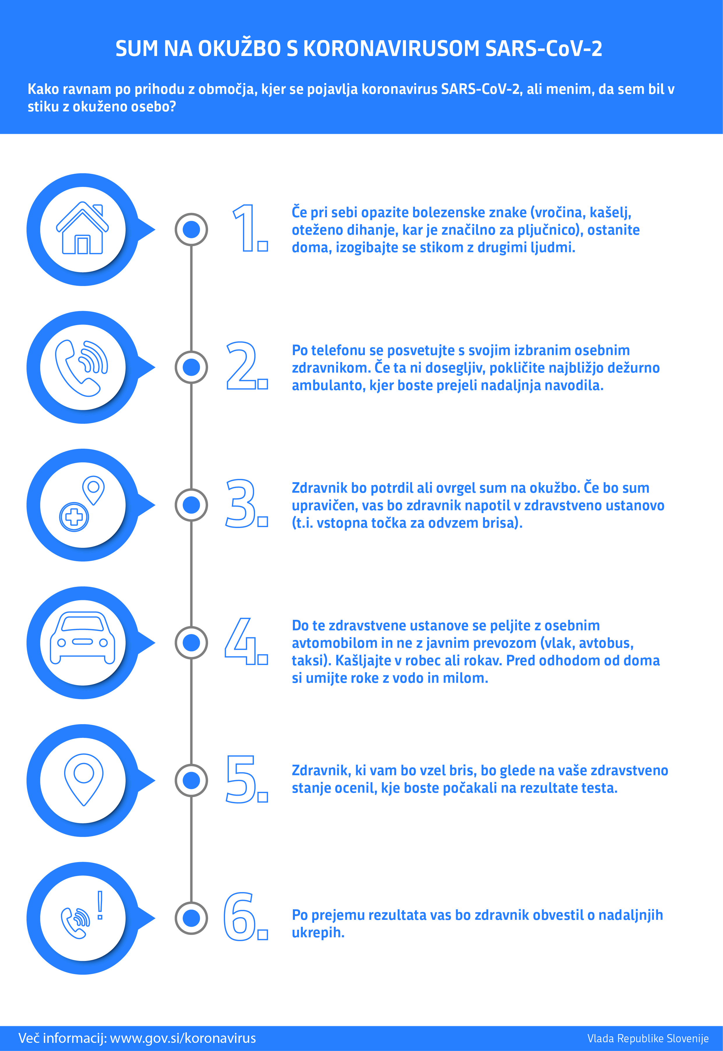 Vlada Republike Slovenije si ves čas prizadeva, da državljanom in vsem, ki se nahajajo na območju Slovenije, zagotavlja aktualne, natančne in pravočasne informacije. Vlada javnost sproti obvešča o razvoju dogodkov na osrednjem spletnem mestu o koronavirusu (https://www.gov.si/podrocja/zdravje/preventiva-in-skrb-za-zdravje/obvladovanje-nalezljivih-bolezni/koronavirus/) in prek družbenih omrežij (TW: @vladaRS, FB Vlada RS).