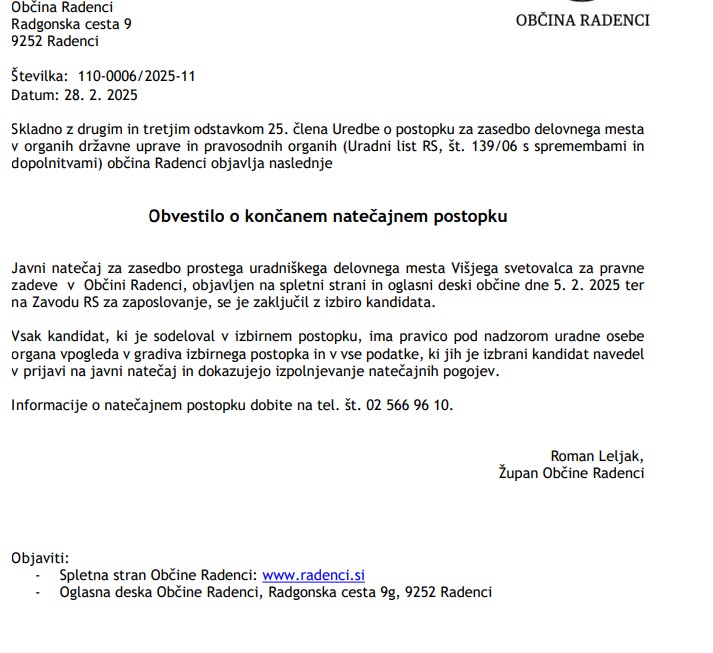 Obvestilo o končanem natečajnem postopku