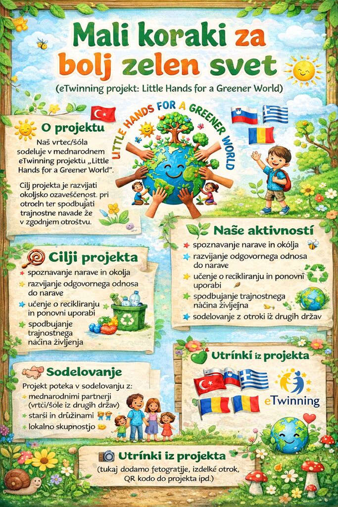 V Vrtcu Radlje ob Dravi, v oddelku 11 v Vuhredu, sodelujemo v mednarodnem projektu Little Hands for a Greener World, ki povezuje vrtce iz Turčije, Romunije, Slovenije in Grčije. Projekt je usmerjen v spodbujanje okoljske ozaveščenosti pri otrocih ter razvijanje trajnostnih vrednot že v zgodnjem otroštvu.