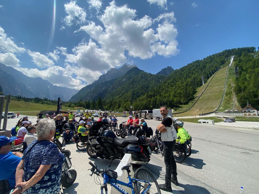 Pot nas je iz Mojstrane vodila po kolesarski poti, kjer je do leta 1966 potekal železniški promet. Ob kratkem postanku v centru Kranjske Gore nas je pozdravila podžupanja Klavdija Gomboc. Odpravili smo se naprej v dolino pod Poncami. Ko smo prispeli do Nordijskega centra Planica, smo si privoščili malico in malo odmora za ogled tega modernega središča. Nekateri so se tudi zapeljali po izteku letalnice ter si ogledali lesen spomenik, posvečen Domnu Prevcu in njegovemu svetovnemu rekordu. Pred odhodom nazaj proti izhodišču nas je prišel pozdravit predsednik zavoda Beli Angeli, Željko Perdija. Njihovo poslanstvo je nuditi pomoč motoristom ob morebitnih nesrečah. Ker je bilo tudi med nami nekaj paraplegikov po nesrečah z motorjem, je poudaril na velik pomen našega skupnega sodelovanja. Na poti nazaj proti Mojstrani smo se ustavili v okrepčevalnici Postaja, kjer nam je osvežilno pijačo priskrbel predstavnik podjetja RTS Medical d.o.o., Robert Žerovnik. Nato je sledilo še kosilo v piceriji Špajza in druženje v pozne popoldanske ure. »Izletniki«, ki so si šli ogledat jezero Jasna in Rusko kapelico, pa so srečali košarkarsko legendo Gorana Dragića. Nekateri pa smo si ogledali v vasi še park olimpijcev in Muzej planinstva.