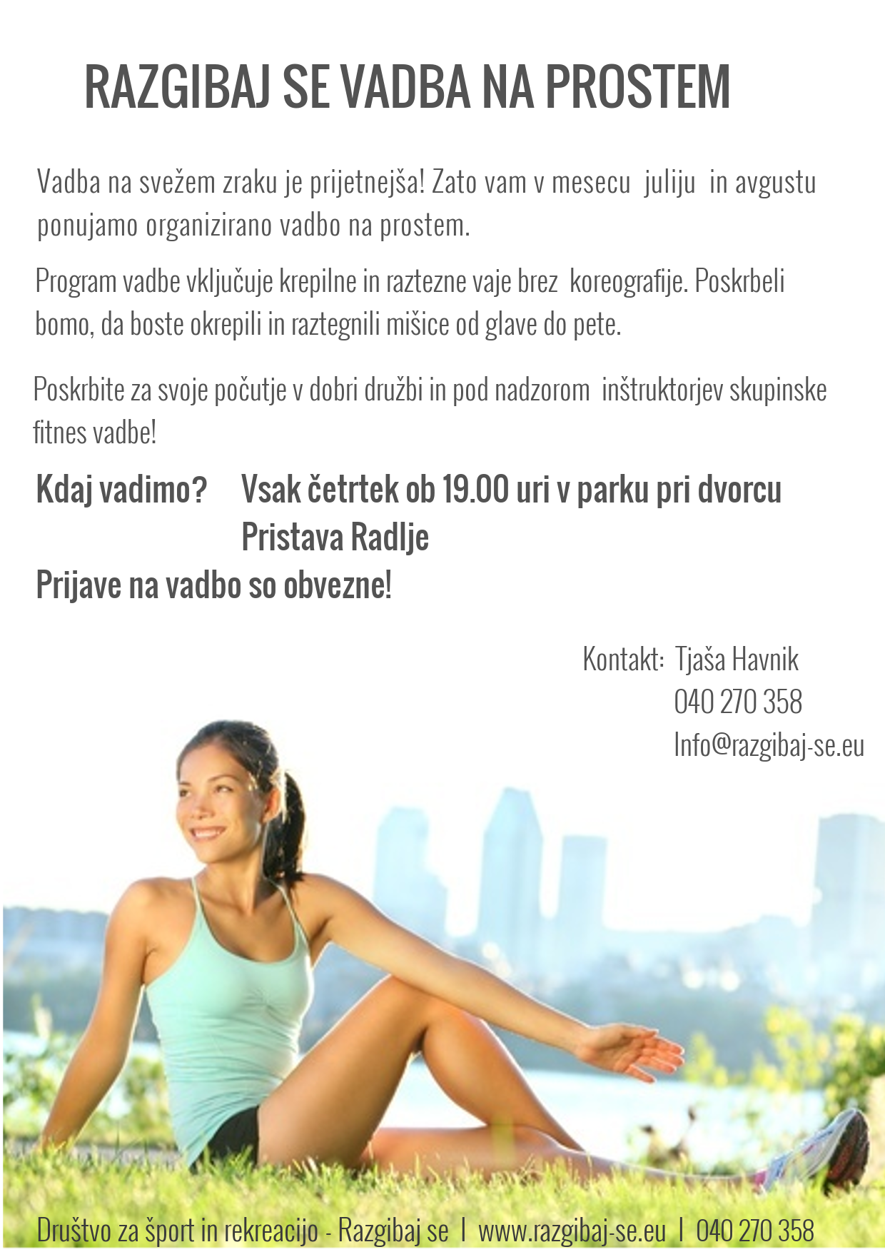 Vadba na svežem zraku je prijetnejša. Zato vam v Društvo za šport in rekreacijo Razgibaj se v mesecu juliju in avgustu ponujamo organizirano vadbo na prostem.