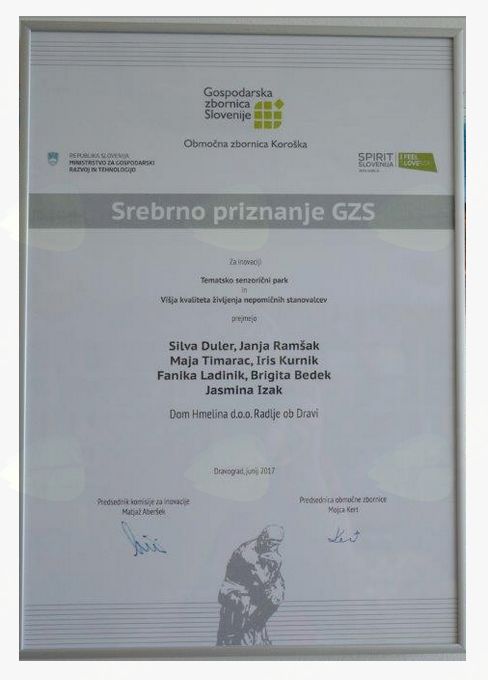 Skupen cilj vodstva in zaposlenih ter želja, da našim stanovalcem in njihovim svojcem ponudimo nekaj več, sta nas pripeljala do Srebrnega priznanja za inovaciji: »Višja kvaliteta življenja nepomičnih stanovalcev« ter »Tematsko senzorični park«, ki ga podeljuje Gospodarska Zbornica Slovenije Območna zbornica Koroške.