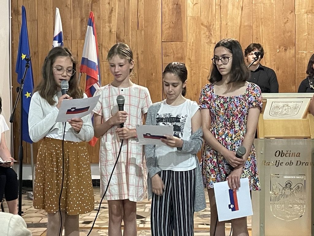 V petek, 23. 6. 2023, je v Dvorcu Radlje ob Dravi potekala proslava ob dnevu državnosti, na kateri so nastopile tudi učenke naše šole: četrtošolka Anika Mrakič, šestošolki Ajda Osrajnik in Eva Horvat ter osmošolka Špela Osrajnik. Recitirale so avtorske pesmice o Sloveniji in Radljah ob Dravi ter ubrano zapele pesem Za Slovenijo živim.