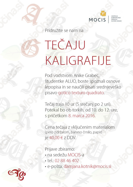 Tečaj bo potekal pod vodstvom Anike Grabec, študentke ALUO, boste spoznali osnove lepopisa in se naučili pisati srednjeveško pisavo gotico texturo quadrato.