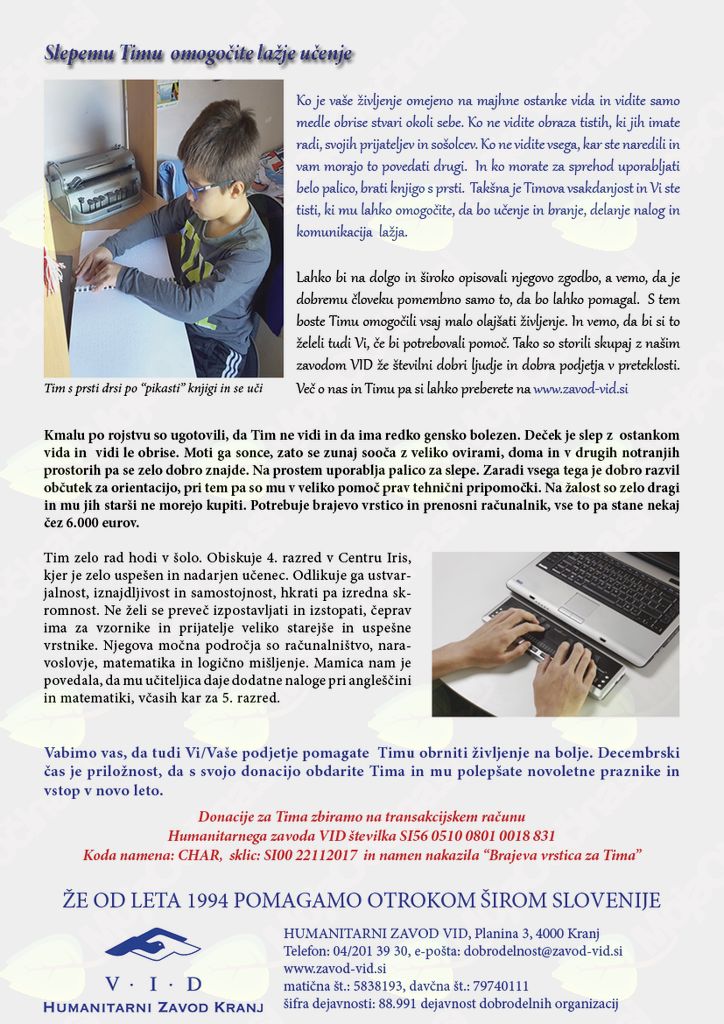 Verjamemo, da nihče ne bi zamenjal svojega življenja z življenjem in težavami slepega 10-letnega Tima Jurkasa iz Ljubljane. Lahko pa mu pomagate, da bodo njegove težave manjše. Tako, kot že četrt stoletja počno skupaj z nami dobri ljudje in podjetja, ki se ne obrnejo stran, ko jih zaprosimo za sodelovanje pri spreminjanju otrošškega sveta na bolje.