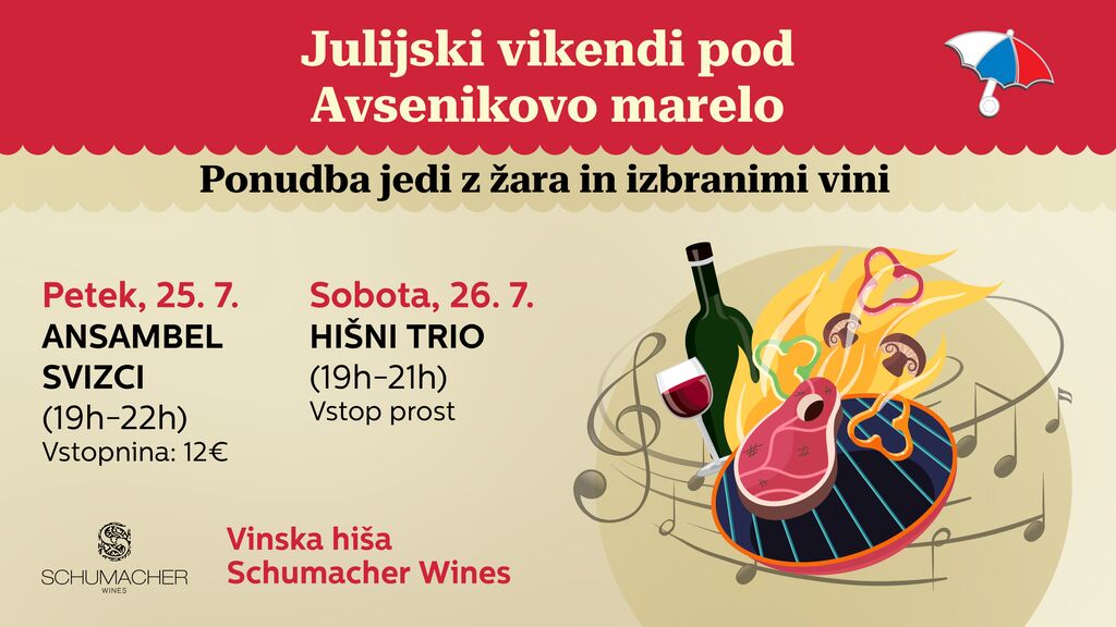 Celoten teden bo v znamenju Vinske hiše Schumacher, ki nas bo s svojo prisotnostjo in vrhunskimi vini razvajala vse do vrhunca – skupnega druženja pod Avsenikovo marelo.