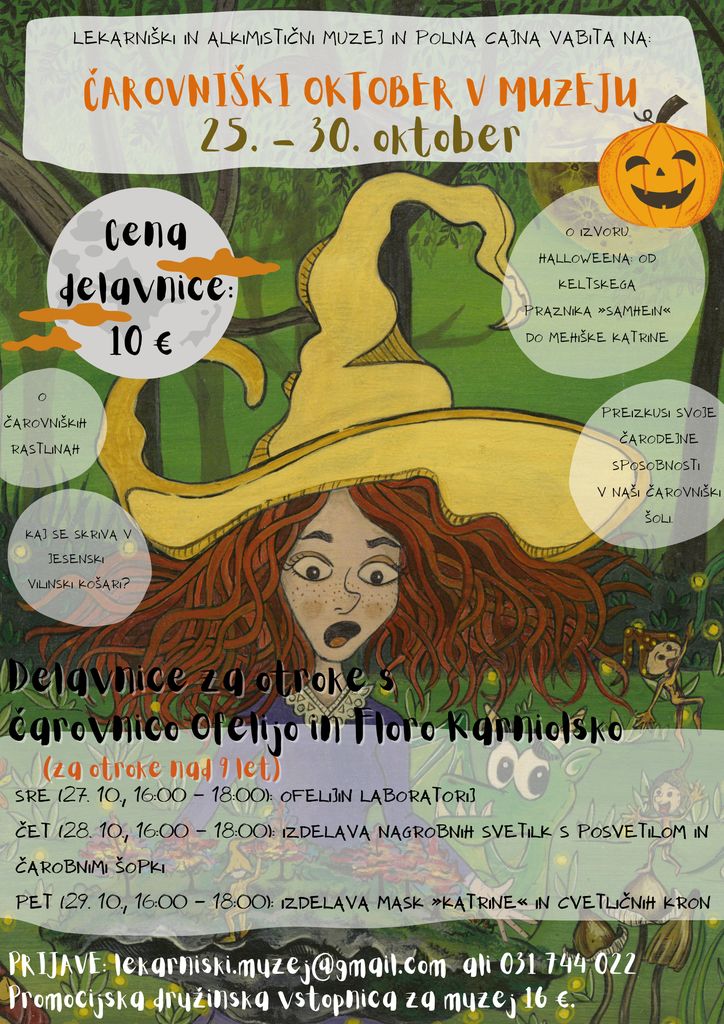 Delavnice so primerne za otroke nad 9. letom starosti. Izvajale se bodo od srede, 27. 10., do petka, 29. 10., v popoldanskih urah (16:00-18:00). Cena za posamezno delavnico je 10€, prijave pa zbiramo na lekarniski.muzej@gmail.com ali 031 744 022.