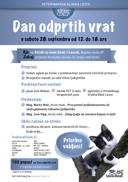 Vabljeni na dan odprtih vrat, ki se bo odvijal na parkirišču Veterinarske klinike v Lescah, Alpska cesta 49, Lesce