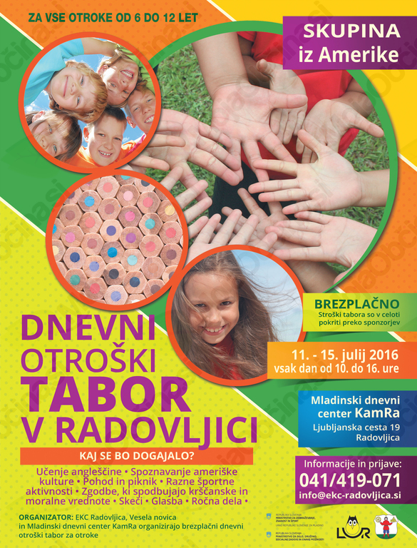 Društvo Več Radovljica in EKC Radovljica v sodelovanju z Mladinskim dnevnim centrom KamRa organizirajo brezplačni dnevni otroški tabor. Tokrat se nam bodo pridružili prijatelji iz ZDA, ki že vrsto let delajo z otroci. Ne bo manjkalo iger, raziskovanja, učenja angleščine, športa, pohoda in piknika v naravi, ročnih del, glasbe in pogovorov o vrednotah, kot so spoštovanje, odgovornost, sočutnost, zanesljivost, dobrotljivost, ki izhajajo iz najstarejše knjige na svetu.