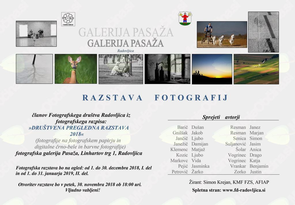 V fotografski galeriji Pasaža, Radovljiška graščina, Linhartov trg 1, v mesecu decembru 2018 I. del in januarja 2019 II. del razstavljajo članice in člani Fotografskega društva Radovljica s papirnatimi fotografijami in barvnimi in črno-belimi digitalnimi fotografijami iz razpisa za Društveno pregledno fotografsko razstavo 2018.