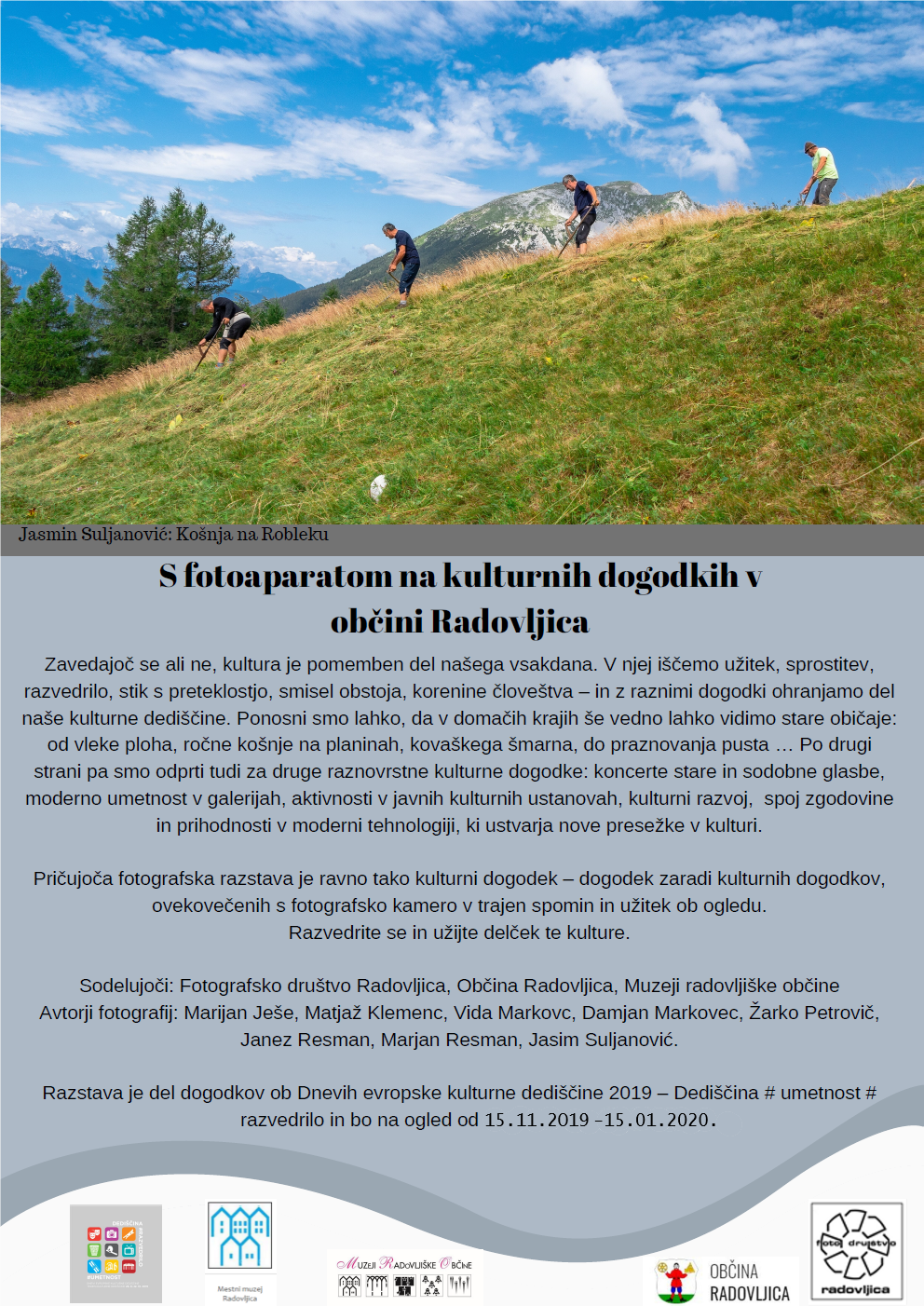 Pričujoča fotografska razstava je ravno tako kulturni dogodek – dogodek zaradi kulturnih dogodkov, ovekovečenih s fotografsko kamero v trajen spomin in užitek ob ogledu. Razvedrite se in užijte delček te kulture. Razstava je del dogodkov ob Dnevih evropske kulturne dediščine 2019 – Dediščina # umetnost # razvedrilo in je bila pred tem postavljena v hodniku Muzejev občine Radovljica v Radovljiški graščini.