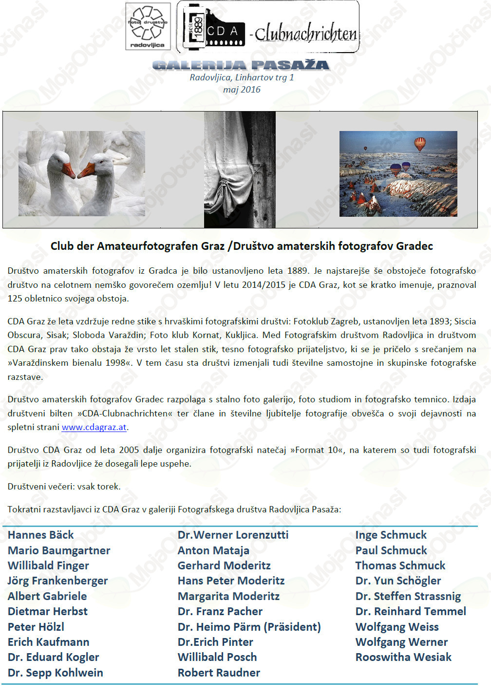 V fotografski galeriji Pasaža v Radovljiški graščini, Linhartov trg 1 v mesecu maju 2016 razstavljajo člani prijateljskega amaterskega fotografskega kluba CDA Graz iz Gradca na Avstrijskem Štajerskem z barvnimi in črno-belimi fotografijami.