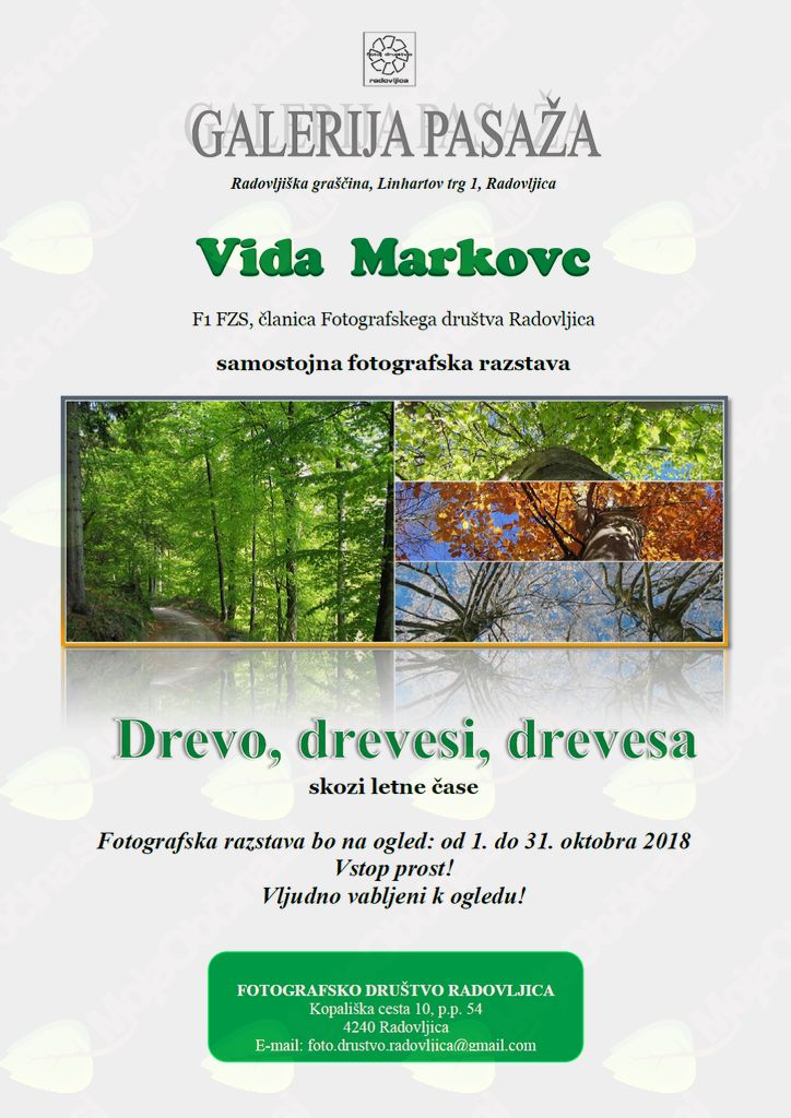 V fotografski galeriji Pasaža v Radovljiški graščini, Linhartov trg 1 v Radovljici bo od 1. do 31. oktobra 2018 razstavljala Vida Markovc, F1 FZS, članca Fotografskega društva Radovljica. Naslov fotografske razstave je “Drevo, drevesi, drevesa”. Predstavlja se nam s fotografijami, ki jih je posnela na svojih poteh s kamero v rokah.
