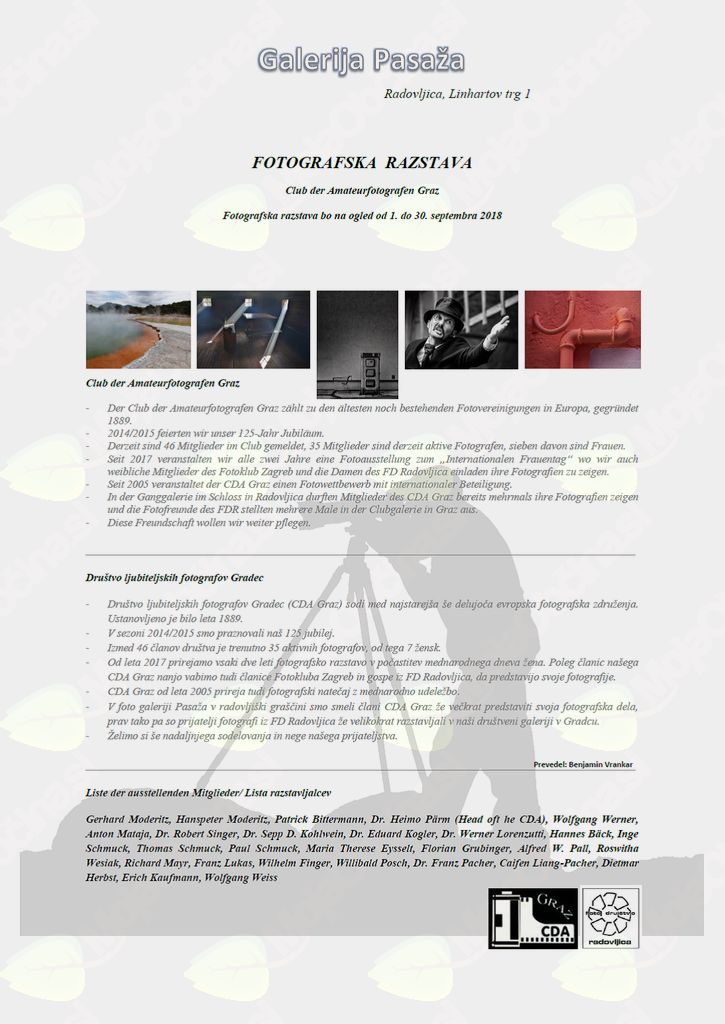 V fotografski galeriji Pasaža v Radovljiški graščini, Linhartov trg 1 v Radovljici je v mesecu septembra 2018 razstava članic in članov CDA Graz, Avstrija.