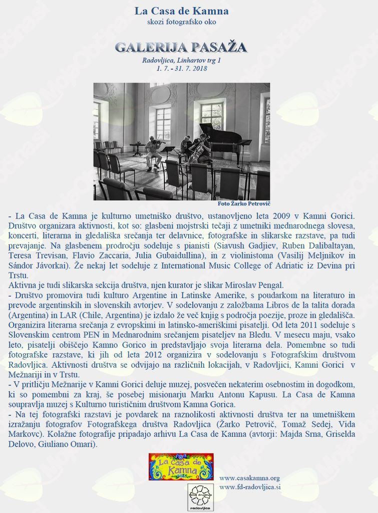 V fotografski galeriji Pasaža v Radovljiški graščini, Linhartov trg 1 v Radovljici v mesecu juliju 2018 je razstava pod naslovom La Casa de Kamna skozi fotografsko oko.