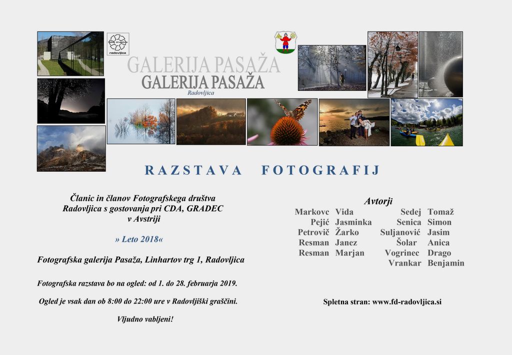 V fotografski galeriji Pasaža, Radovljiška graščina, Linhartov trg 1, Radovljica v mesecu februarju 2019 razstavljajo članice in člani Fotografskega društva Radovljica s barvnimi in črno-belimi fotografijami z razstave v Gradcu, Avstrijska Štajerska pod naslovom Leto 2018. Vljudno vabljeni k ogledu!