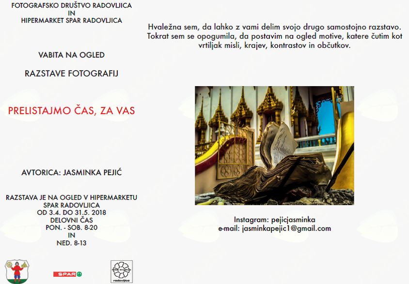 V hipermarketu Spar, Gradnikova 1b, Radovljica bo od 3. aprila do 31. maja 2018 razstavljala Jasminka Pejić, članca Fotografskega društva Radovljica. Naslov fotografske razstave je “Prelistajmo čas, za vas”. Ogled je možen v odpiralnem času hipermarketa Spar Radovljica.