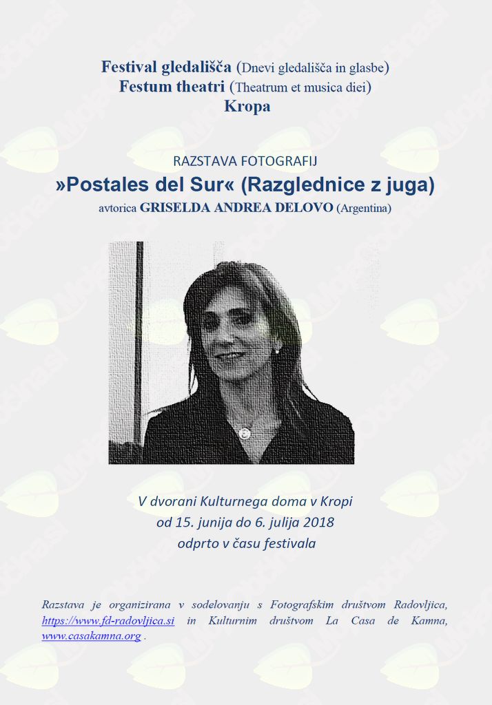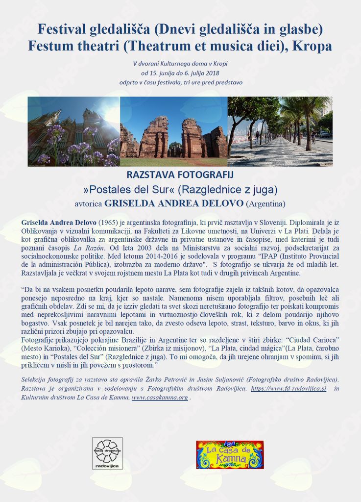 V Kulturnem domu Kropa, Kropa 3 bo od 15. junija do 6. julija 2018 razstavljala Griselda Andrea Delovo, fotografinja iz Argentine, ki prvič razstavlja v Evropi in to v Sloveniji. Naslov fotografske razstave je “Postales del sur - Razglednice z juga”. Razstavo sta v sodelovanju pripravila KUD La Casa de Kamna, Kamna Gorica in Fotografsko društvo Radovljica v času 5. festivala gledališča v Kropi. Ogled je možen tri ure pred posamezno predstavo v Dnevih gledališča in glasbe.