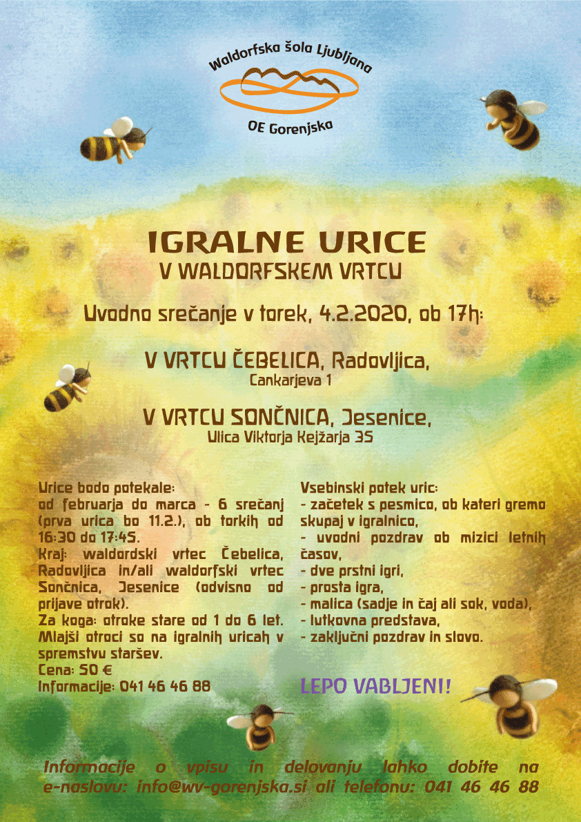 so odličen način uvajanja otrok v vrtec, zato jih bomo v vrtcu Sončnica na Jesenicah in/ali v vrtcu Čebelica v Radovljici organizirali od februarja do marca 2020. Namenjene bodo predvsem otrokom, ki bi jih starši radi vpisali v waldorfski vrtec. Igralnih uric se seveda lahko udeležijo tudi tisti otroci, ki jih starši ne nameravajo vpisati v waldorfski vrtec.
