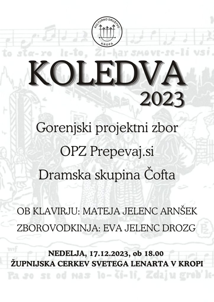 Letošnji koledniški koncert bodo oblikovali Gorenjski projektni zbor, Otroški pevski zbor Prepevaj.si in Dramska skupina Čofta Kulturnega društva Kropa.