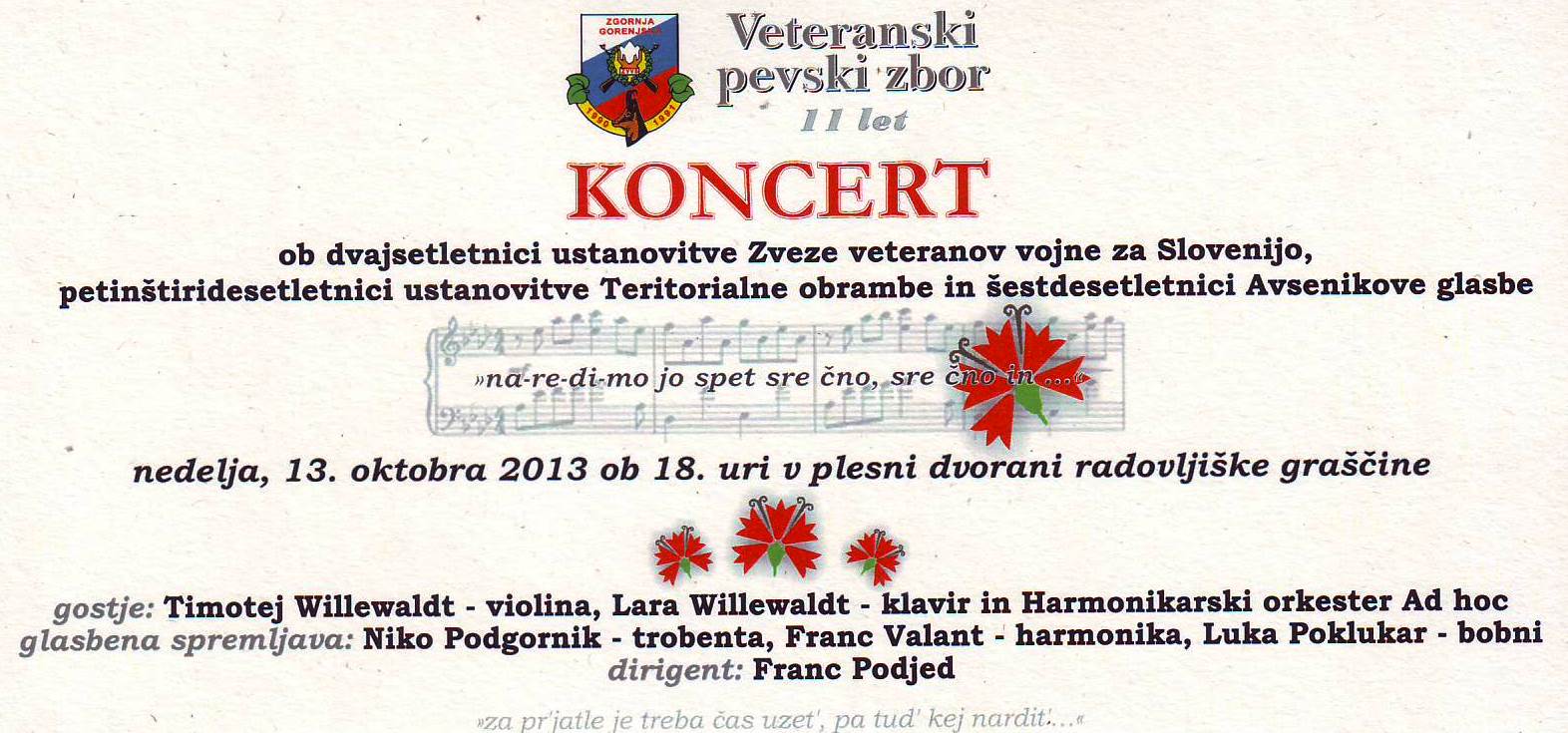Veteranski pevski zbor OZ VVS Zgornja Gorenjska z dirigentom Francem Podjedom vabi na koncert v počastitev 20-letnice ustanovitve Zveze veteranov vojne za Slovenijo, 45-letnice ustanovitve teritorialne obrambe in 60-letnice Avsenikove glasbe. Koncert bo v plesni dvorani radovljiške graščine, v nedeljo, 13. oktobra, s pričetkom ob 18. uri. Poleg VPZ bodo nastopili še harmonikarski orkester Ad hoc ter mladi Violinist Timotej Willewaldt in pianistka Lara Willewaldt. Program bo povezovalal Branka Smole
