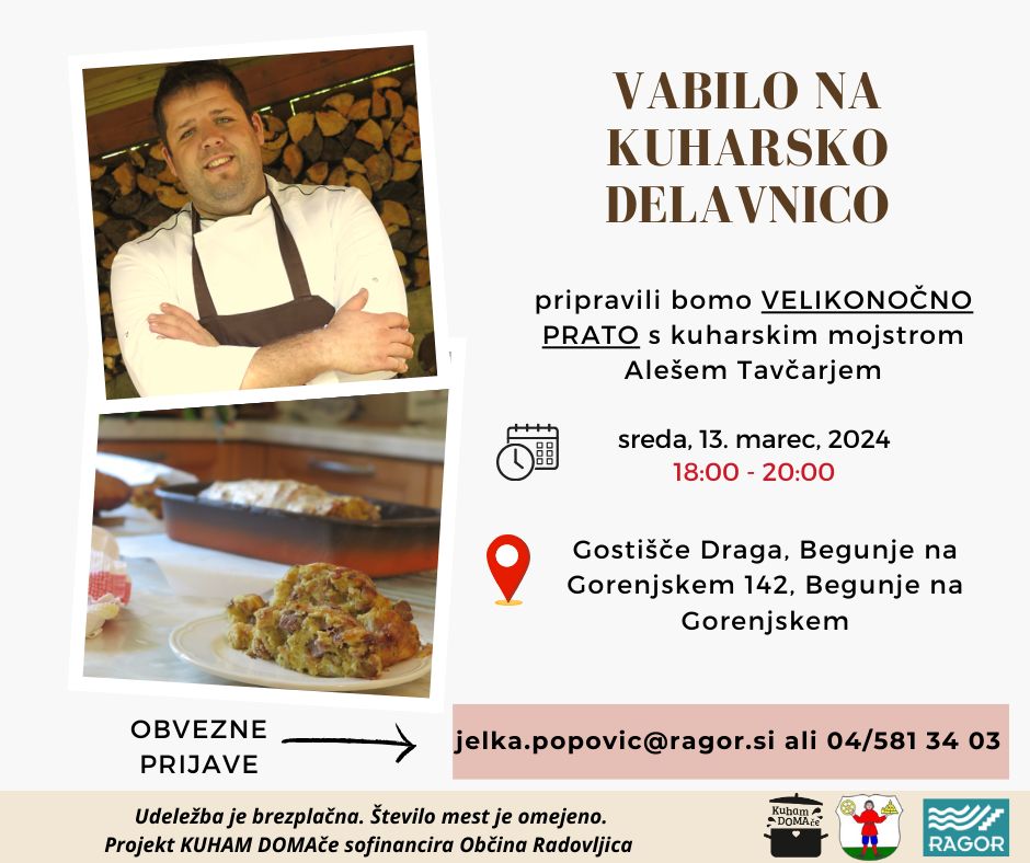 Na drugi letošnji delavnici v sklopu projekta KUHAM DOMAče bo kuharski mojster Aleš Tavčar pripravil Velikonočno prato. Zaupal nam bo svoje ideje in nasvete kako ustvariti praznično omizje.