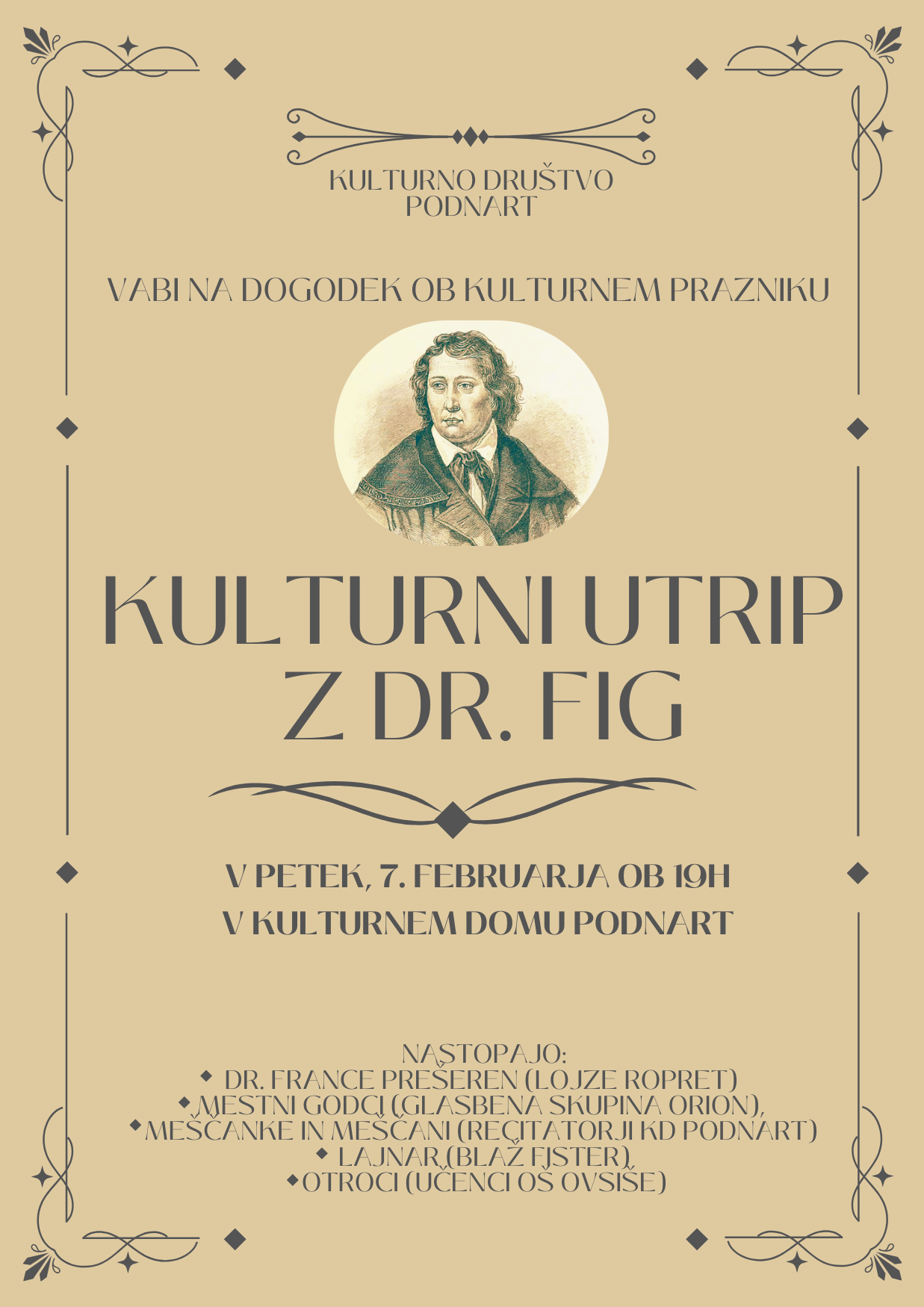 "KULTURNI UTRIP Z DR. FIG". Več o raznovrstnosti nastopajočih si lahko preberete spodaj in v priponki. Tokratni naslov prireditve je prireditev ob kulturnem dnevu na predvečer praznika - . petek, 7. februarja ob 19. uri v Kulturni dom Podnart