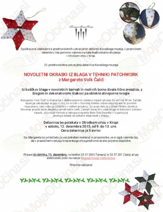 Na 23. prednovoletni ustvarjalni delavnici Kovaškega muzeja bodo udeleženci iz koščkov blaga z novoletnimi motivi šivali lične zvezdice, z blagom in okrasnimi trakovi pa oblekli stiroporne krogle. Ves potreben material bodo udeleženci dobili na delavnici. Cena delavnice je 5 evrov.