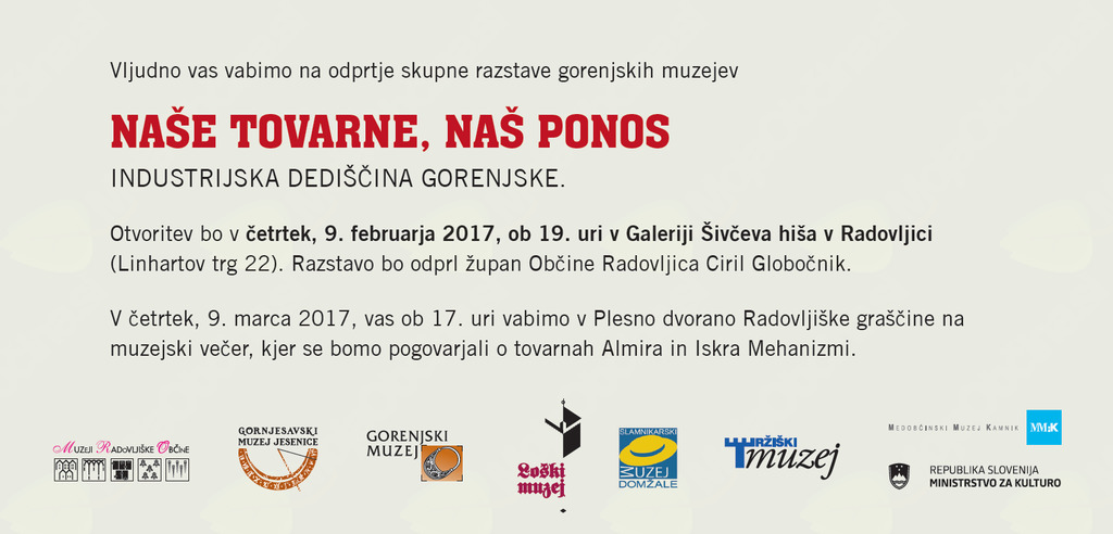 Vabimo vas na odprtje skupne razstave gorenjskih muzejev, ki bo v četrtek, 9. februarja 2017, ob 19. uri v Galeriji Šivčeva hiša v Radovljici (Linhartov trg 22). Razstavo bo odprl župan občine Radovljica Ciril Globočnik.