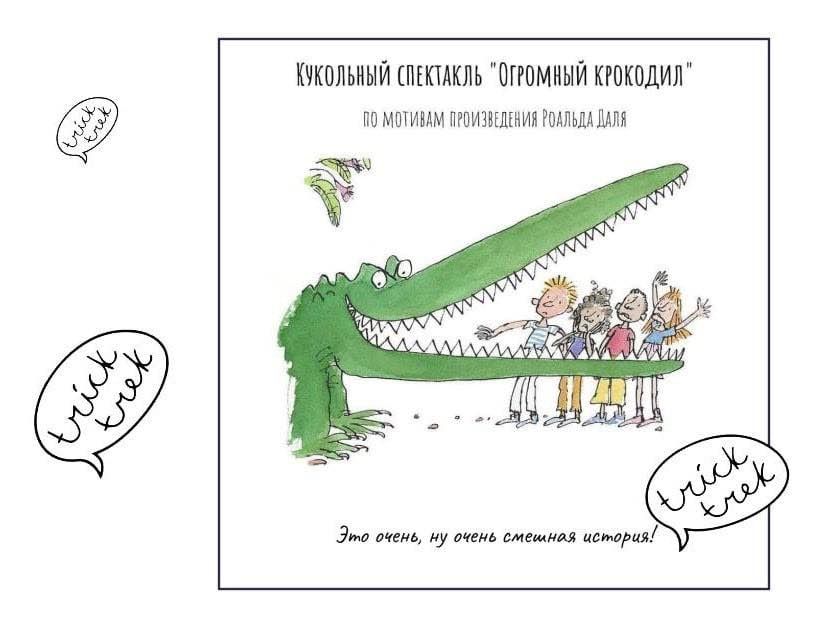 Glavni junak je strašno-grozni, ogabno-neznosni gromozanski KROKODIL, ki sanja o tem, da bi si za kosilo privoščil… otroka! A to ni tako preprosto, zato lačni krokodil skuje celo vrsto bistroumnih trikov in prikaže prave mojstrovine preobleke.
