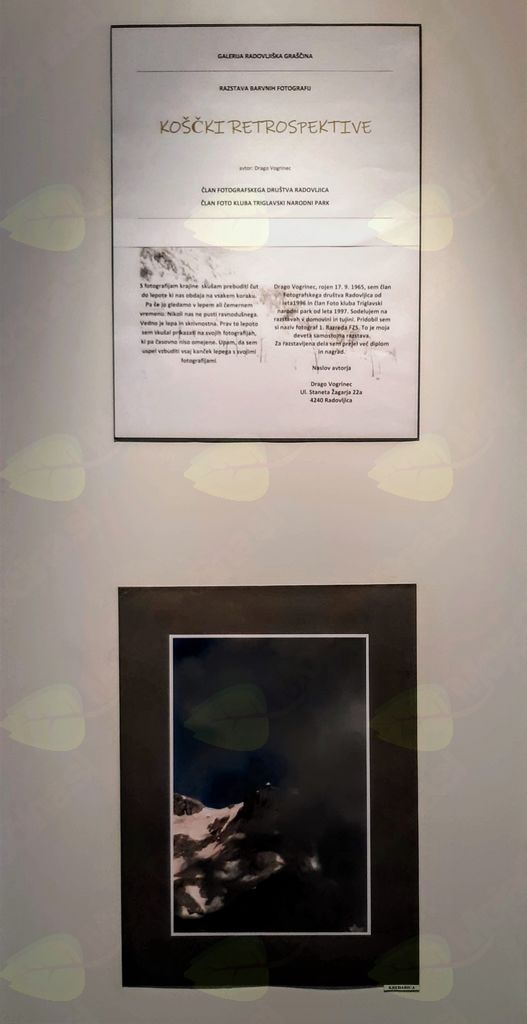V fotografski galeriji Pasaža v Radovljiški graščini, Linhartov trg 1 v Radovljici bo od 1. do 30. novembra 2018 razstavljal Drago Vogrinec, F1 FZS, član Fotografskega društva Radovljica in Foto kluba TNP, Bled. Naslov fotografske razstave je “Koščki retrospektive”. Predstavlja se nam s fotografijami krajine, s katerimi skuša prebuditi čut do lepote, ki nas obdaja na vsakem koraku.
