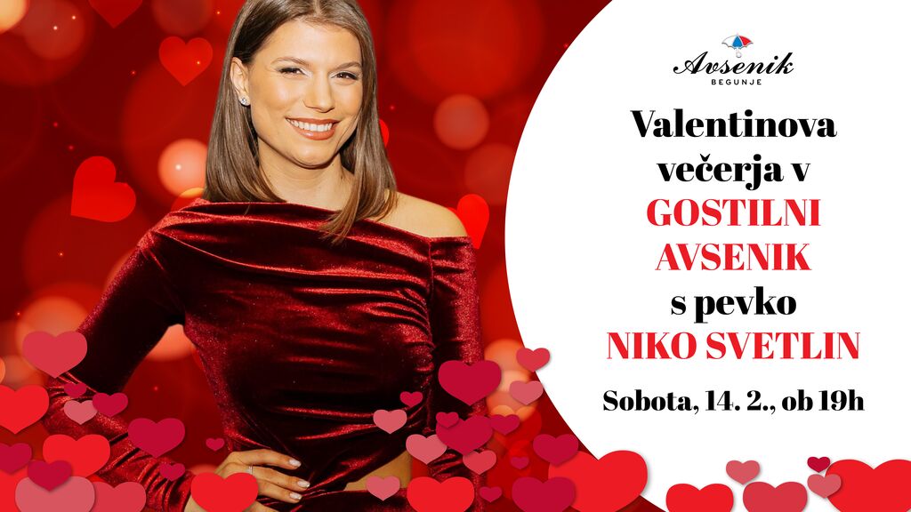 Vabljeni na valentinovo večerjo v Gostilno Avsenik, kjer bo romantično vzdušje obogatila glasba v živo. Za glasbeni del večera bo poskrbela Nika Svetlin, pevka in voditeljica na TV Veseljak - Golica, na klavirju pa jo bo spremljal Blaž Avsenik.