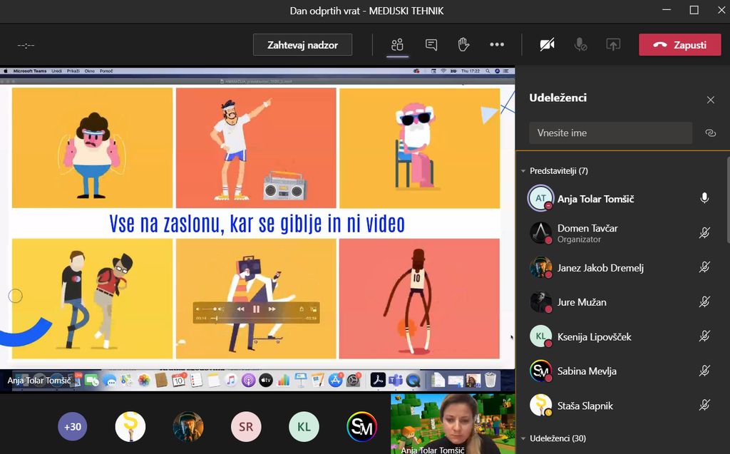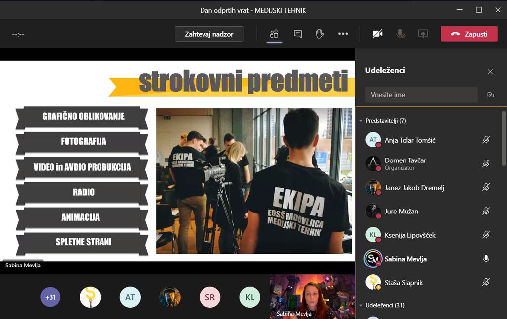 Na koncu so se »vrata odprla« še za medijskega tehnika. Profesorice, ki poučujejo strokovne predmete, so skupaj z dijaki prikazale izdelke, ki nastanejo v vseh štirih letih izobraževanja. Najprej je Sabina Mevlja predstavila tipografijo in produkcijo, Anja Tolar Tomšič animacijo, Staša Slapnik pa izražanje s sliko in zvokov v podobi filmčka, ki ga je posnela skupaj z dijakoma Janezom Jakobom in Jakobom iz 2. a. V končnem klepetu je sodeloval tudi maturant Jure Mužan.