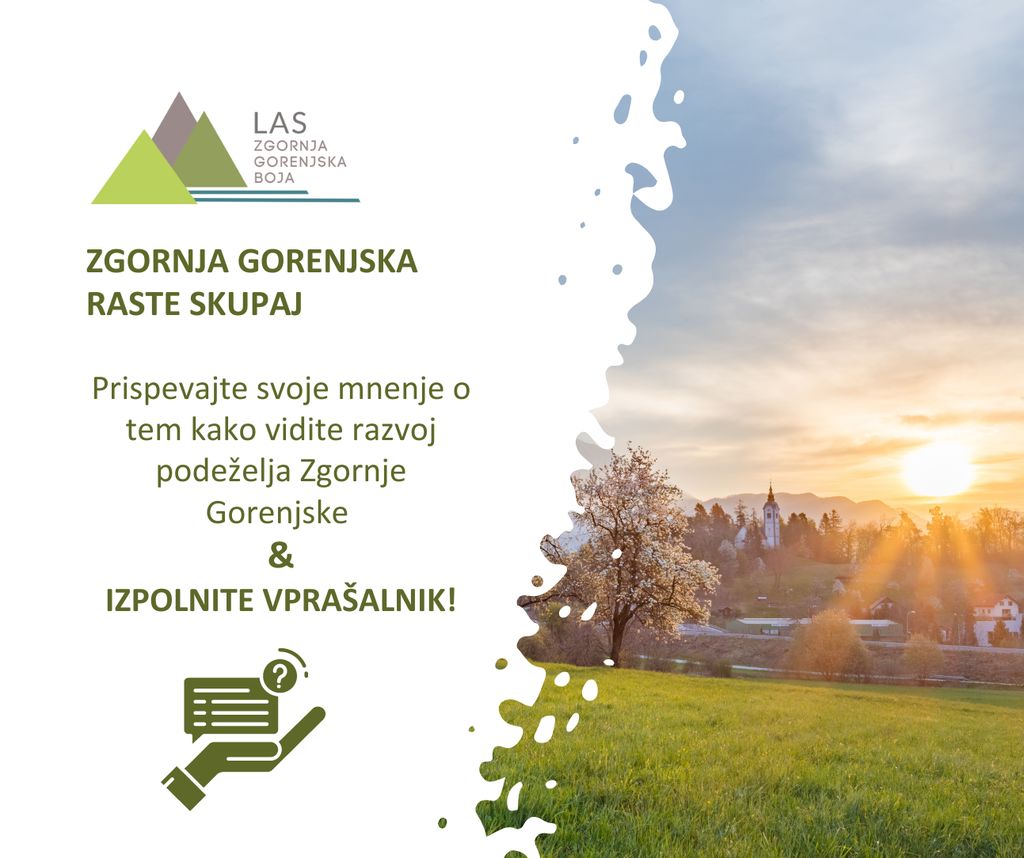 Da pridobimo še širši krog mnenj in da bo strategija naslavljala prave potrebe večine lokalnega prebivalstva, smo oblikovali SPLETNO ANKETO, ki vam ne bo vzela več kot pet minut časa. Na ta način boste lahko prispevali vaše videnje stanja življenja na Zgornji Gorenjski in vizijo kako ga izboljšati.