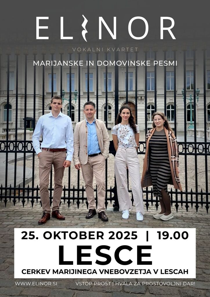 V soboto, 25. oktobra, ob 19h, se bo v cerkvi Marijinega vnebovzetja (Lesce) odvil koncert Vokalnega kvarteta Elinor, ki sodi med prepoznavne slovenske vokalno glasbene sestave.Tokrat bomo slišali spored Marijinih in domovinskih pesmi. Elinor bo sodeloval pri bogoslužju, po maši sledi koncert. Vstop je prost, pevci bodo hvaležni za prostovoljni dar.