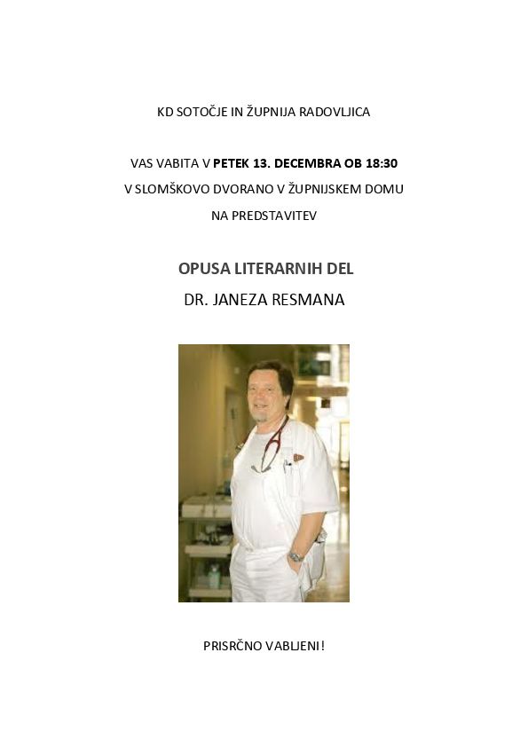 KD Sotočje in Župnija Radovljica vabita v petek, 13. decembra, ob 18:30 v Slomškovo dvorano v Župnijskem domu na predstavitev opusa literarnih del dr. Janeza Resmana.