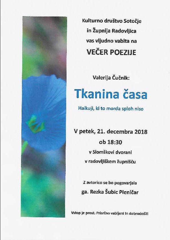 Kulturno društvo Sotočje in Župnija Radovljica vabita v petek, 21. 12. 2018, ob 18:30 uri v Slomškovo dvorano radovljiškega župnišča na PREDBOŽIČNI VEČER POEZIJE VALERIJE ČUČNIK.