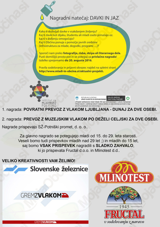 Inštitut za mladinsko politiko v sodelovanju z Uradom RS za komuniciranje razpisuje nagradni natečaj za mlade od 15 do 29 let z naslovom DAVKI IN JAZ. Več o natečaju in prijavi si lahko preberete na tej povezavi: