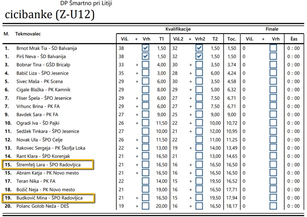 Med cicibankami sta plezali Mina Budkovič in Lara Štremfelj. Za obe je bila to prva tekma DP v težavnosti. Prvo smer sta obe plezali bolje kot drugo. Lara je bila 15., Mina pa 19.