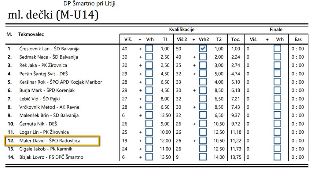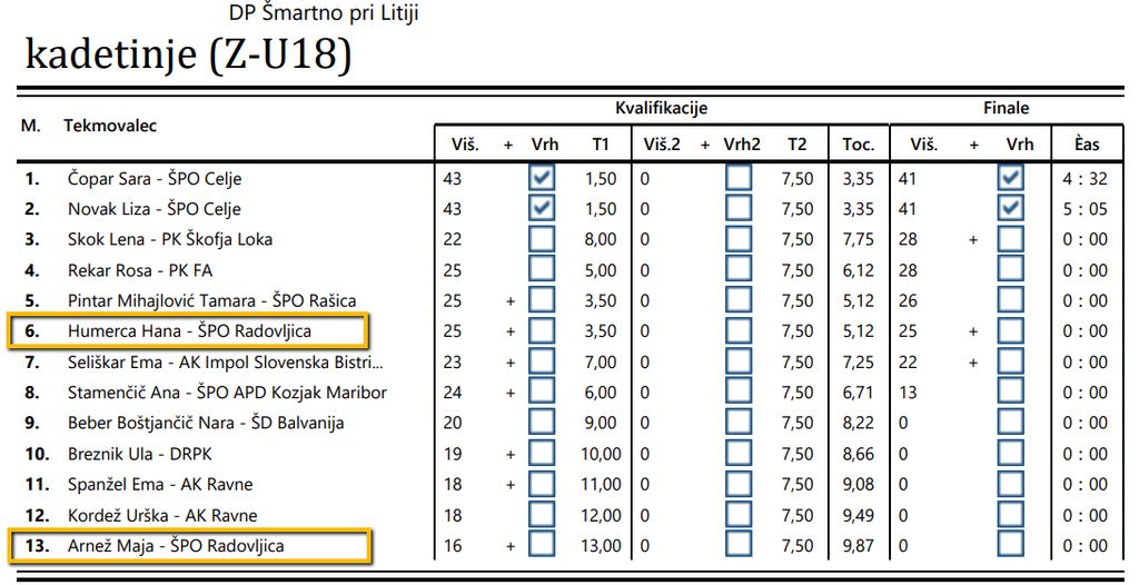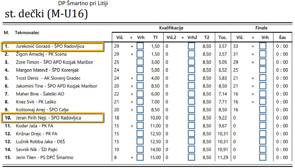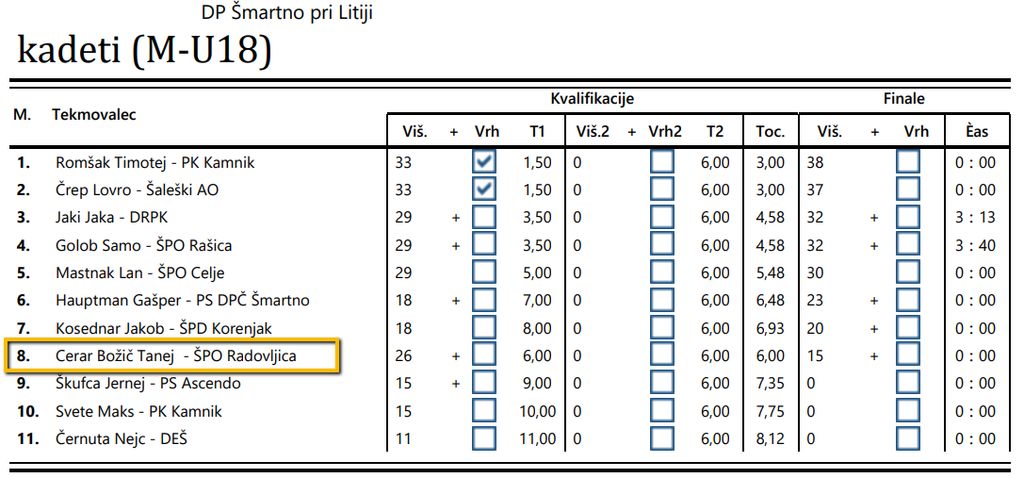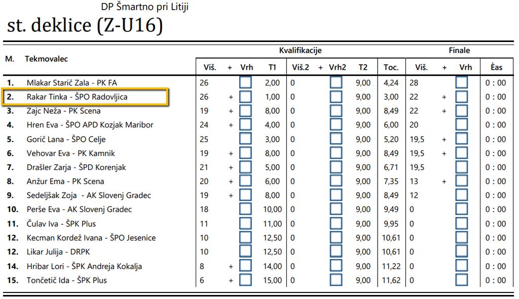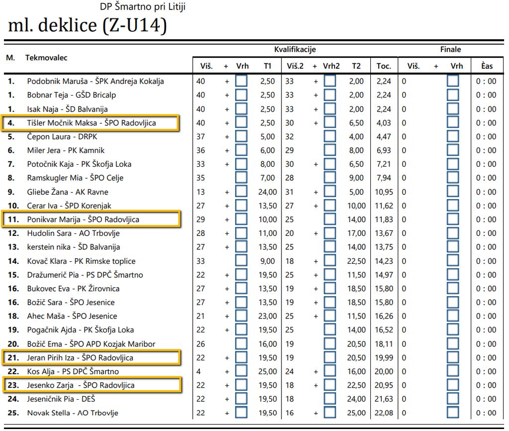 Pri starejših deklicah je v kvalifikacijah za Radovljico plezala le Tinka Rakar, ki je kljub ne najboljšem zaključku osvojila kar prvo mesto in najboljše izhodišče v finalu. Kvalifikacije je na prvem mestu zaključil tudi Gorazd Jurekovič, zmagovalec zadnjih 2 tekem za državno prvenstvo. Pri starejših dečkih je nastopil tudi Nejc Jeran Pirih, ki je po sicer zelo dobrem plezanju moral predčasno zaključiti z nastopom, zaradi nepravilno vpetega kompleta. Tekmovanje je končal na 10. mestu.