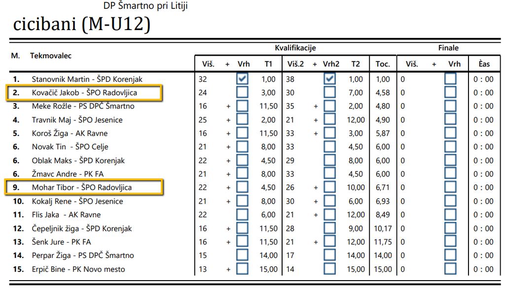 Pri cicibanih je odlično plezal Jakob Kovačič. Obe smeri je prišel visoko, zmanjkalo mu je samo zadnjih nekaj težkih gibov. Uvrstil se je na 2. mesto in prišel do svoje prve medalje na DP. Tudi Tibor Mohar je plezal zelo dobro, sploh v prvi smeri. Dosegel je 9. mesto.