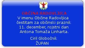 Decembrski praznik občine Radovljica praznujemo na rojstni dan Antona Tomaža Linharta 11. decembra. Letos bodo občinski nagrajenke in nagrajenci prejeli priznanja na predvečer praznika. Posnetek slovesnosti bo objavljen na občinskih spletnih straneh, za javnost pa ne bo odprta, da bi omejili možnosti za širjenje okužb s covidom-19.