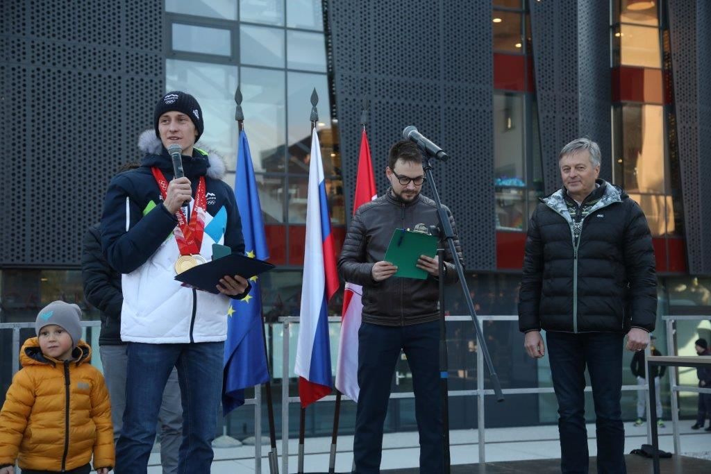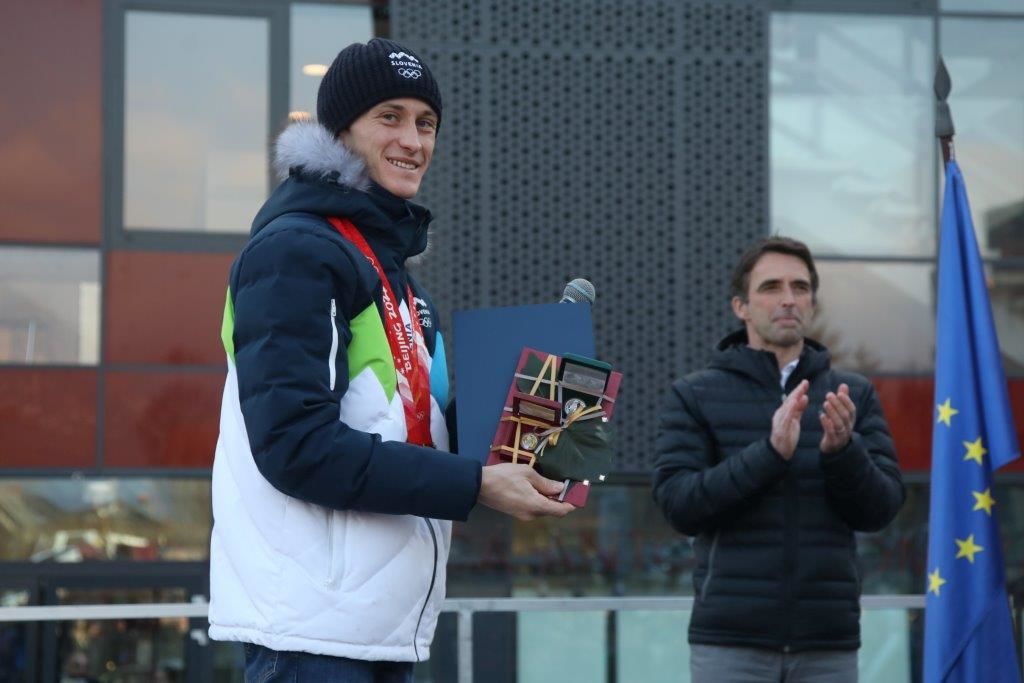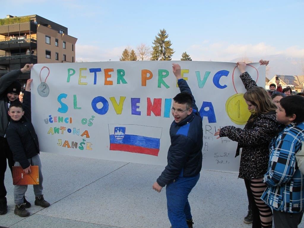 Smučarskega skakalca Petra Prevca, ki živi v Radovljici, je danes ob prihodu z zimskih olimpijskih iger v Pekingu sprejel župan Ciril Globočnik. Na sprejemu na Vurnikovem trgu v Radovljici mu je čestital, izročil nagrado Občine Radovljica in ob osvojeni ekipni zlati in srebrni medalji tudi zlatnik in srebrnik, izdana ob 250-letnici rojstva Antona Tomaža Linharta. Čestital je tudi Jakovu Faku, ki se v domače Lesce iz Pekinga še ni vrnil, za udeležbo na olimpijskih igrah pa bo prav tako prejel nagrado.