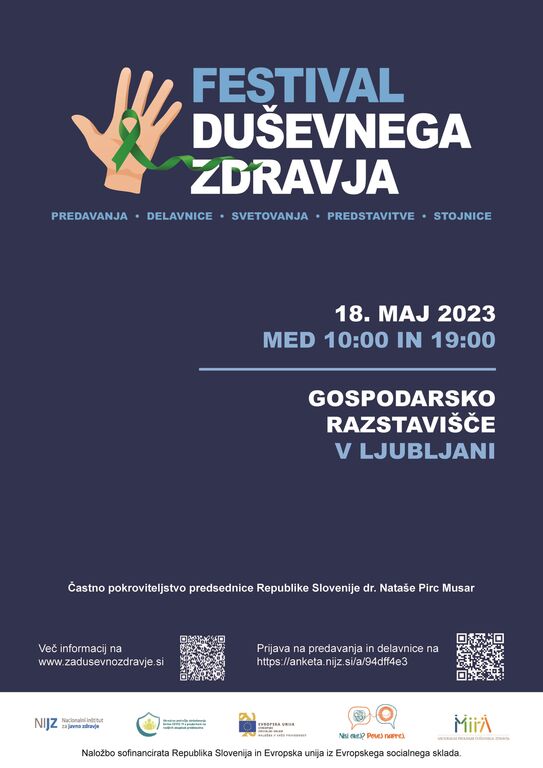 Nacionalni inštitut za javno zdravje (NIJZ) vabi na Festival duševnega zdravja, ki bo v četrtek, 18. maja 2023 med 10. in 19. uro, na Gospodarskem razstavišču v Ljubljani.