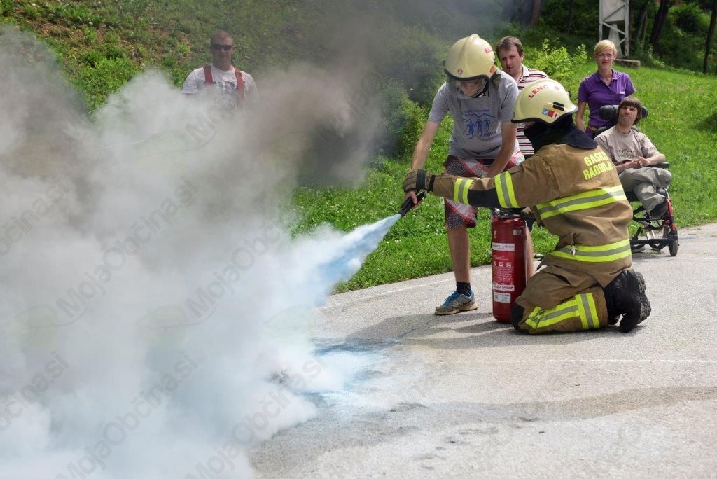 Člani prostovoljnega gasilskega društva iz Radovljice so se z vso resnostjo lotili vaje in za konec še omogočili ogled gasilskih vozil in poskus gašenja požara.