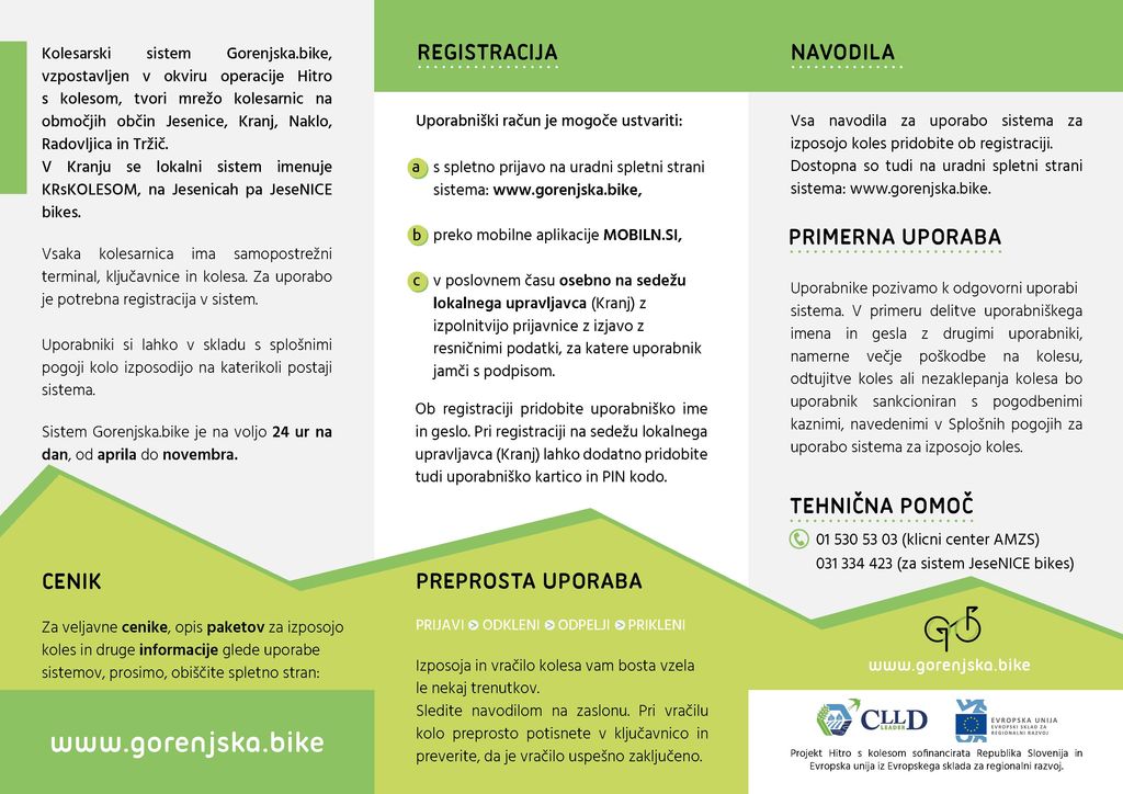 Gorenjska.bike je kot enoten sistem izposoje koles vzpostavljen še v štirih gorenjskih občinah: na Jesenicah, v Naklem, Tržiču in Kranju.  Vsaka kolesarnica ima samopostrežni terminal, ključavnice in kolesa. Za uporabo je potrebna registracija v sistem. Uporabniki si kolo lahko izposodijo na katerikoli postaji sistema Gorenjska.bike. V mestni občini Kranj je nameščenih 28 postaj, v občini Jesenice 6, v občini Tržič 3, v občin Naklo pa 1. Skupaj je na razpolago 245 koles, od tega jih je nekaj več kot polovica s pomožnim električnim pogonom.