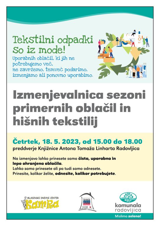 Izmenjevalnica sezoni primernih oblačil in hišnih tekstilij Četrtek, 18. 5. 2023, od 15.00 do 18.00 |