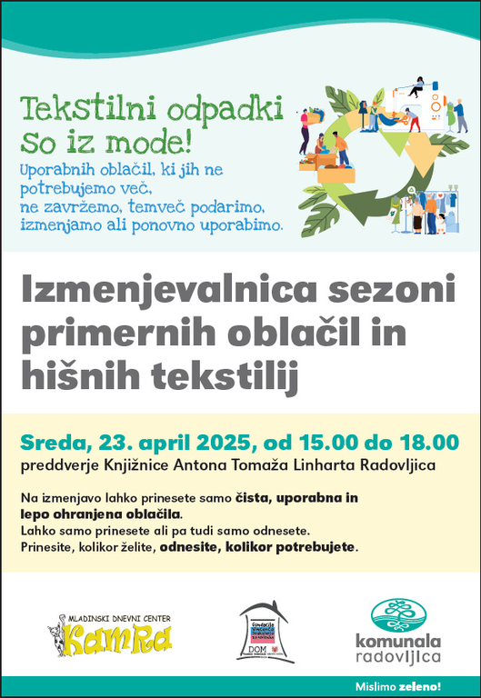 V sredo, 23. aprila 2025, od 15. do 18. ure Komunala Radovljica, Fundacija Vincenca Drakslerja in Mladinski dnevni center Kamra organizirajo že 6. izmenjevalnico oblačil in hišnih tekstilij. Potekala bo v preddverju Knjižnice Antona Tomaža Linharta Radovljica.